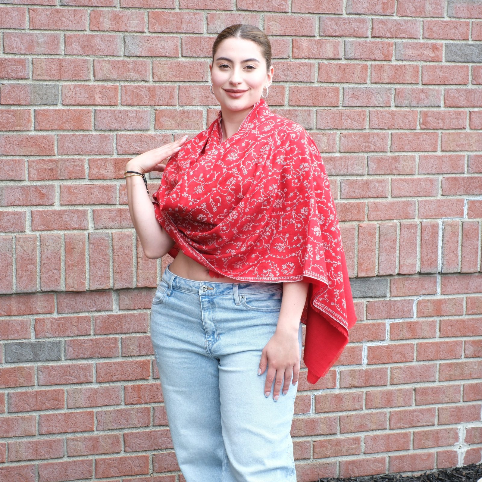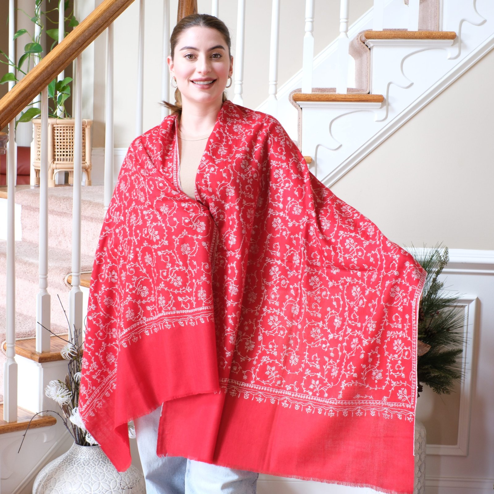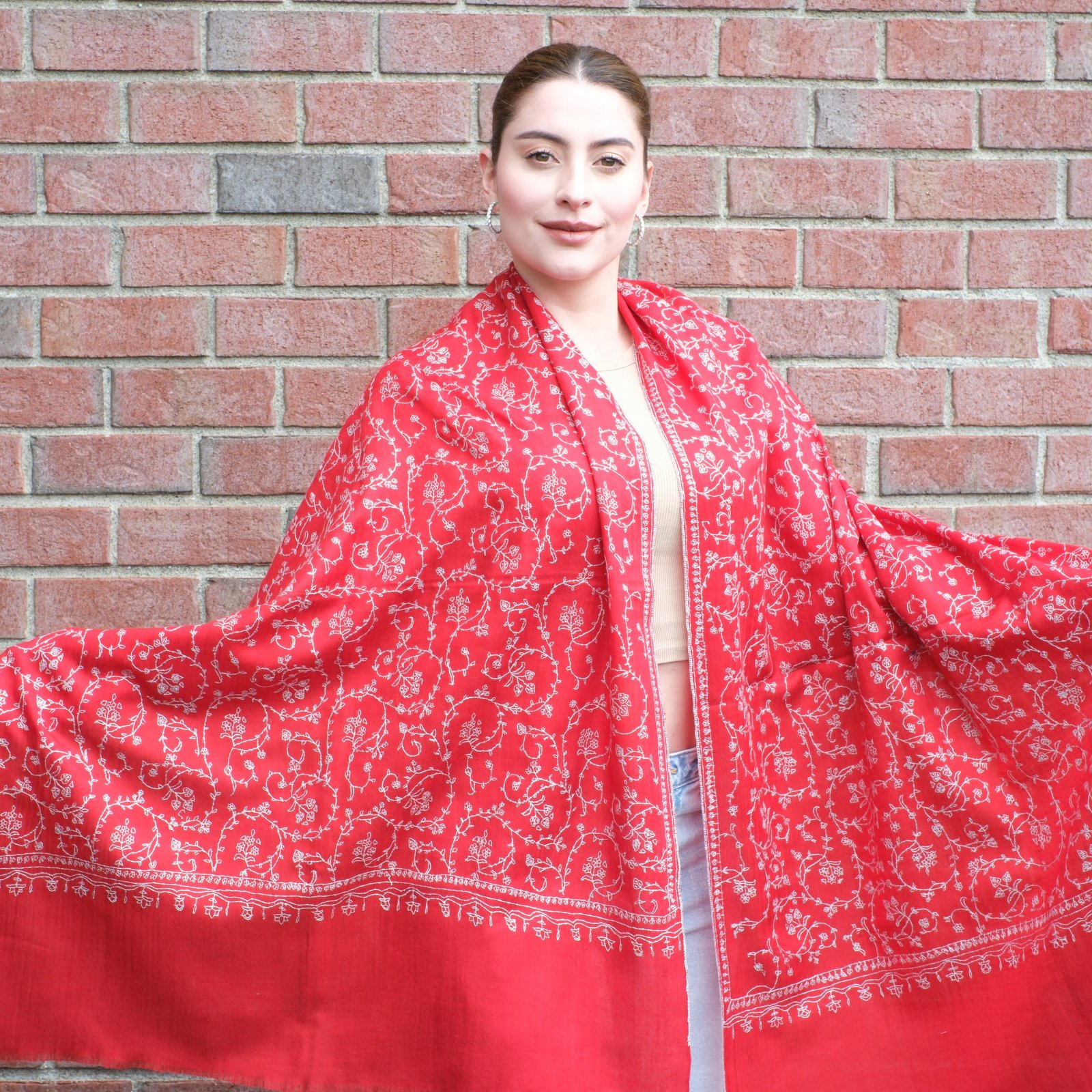 The Crimson Blossom Wrap is a celebration of color, craft, and heritage. Handwoven from pure Ladakhi pashmina and embroidered with an intricate sozni jaal, it carries months of dedication and artistry in every thread. The vivid crimson red base makes a bold statement, while the ivory embroidery softens it with balance and refinement. Together, they create a piece that feels both festive and timeless.