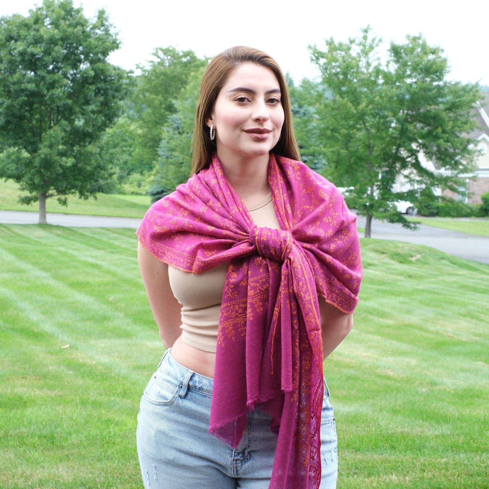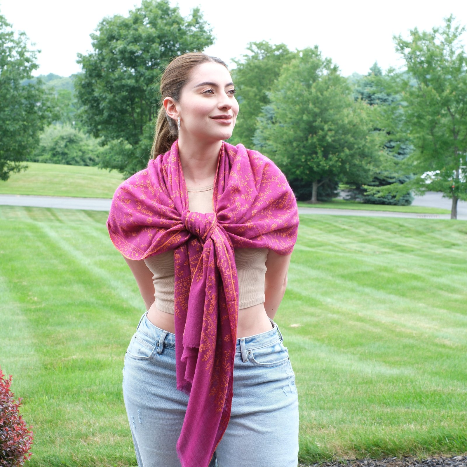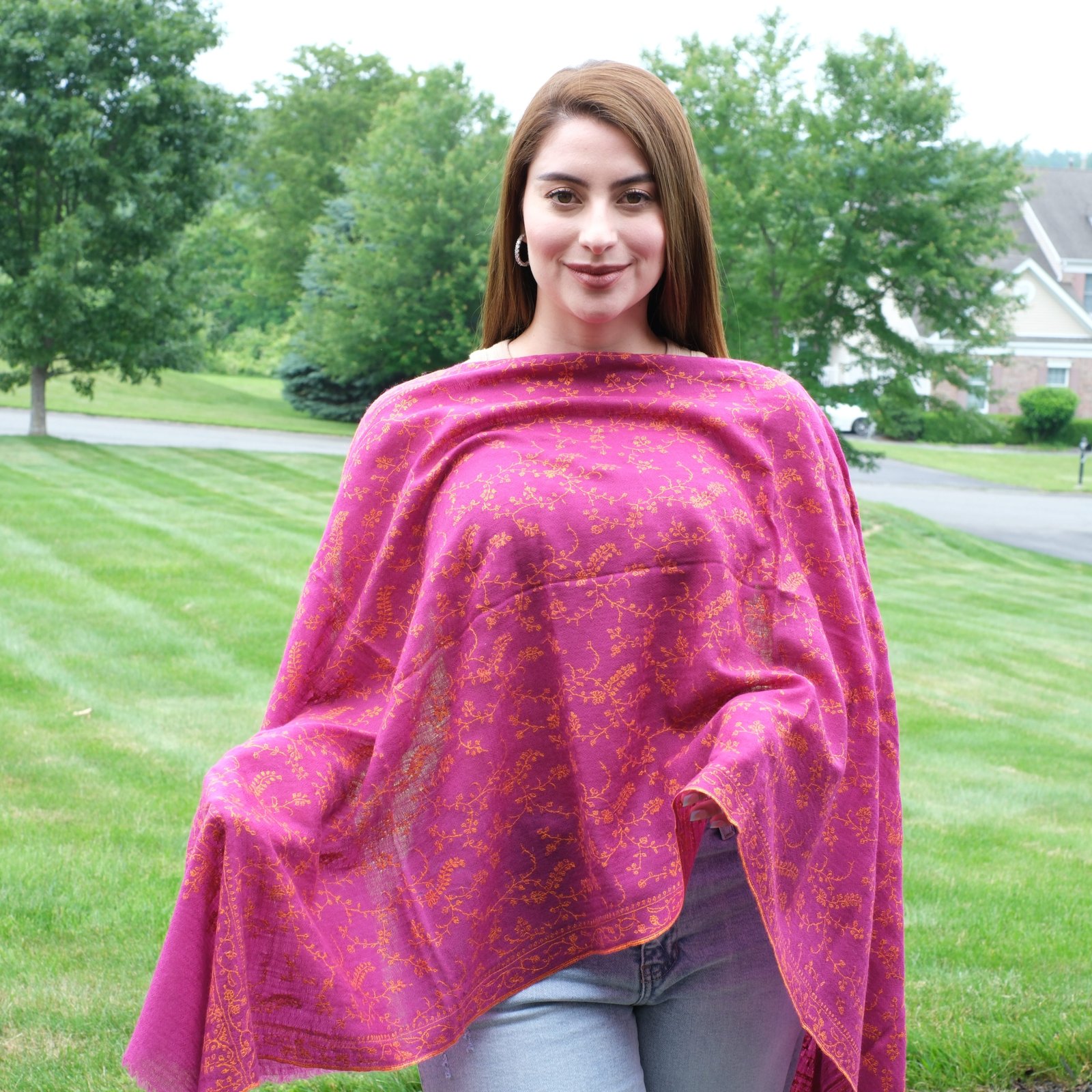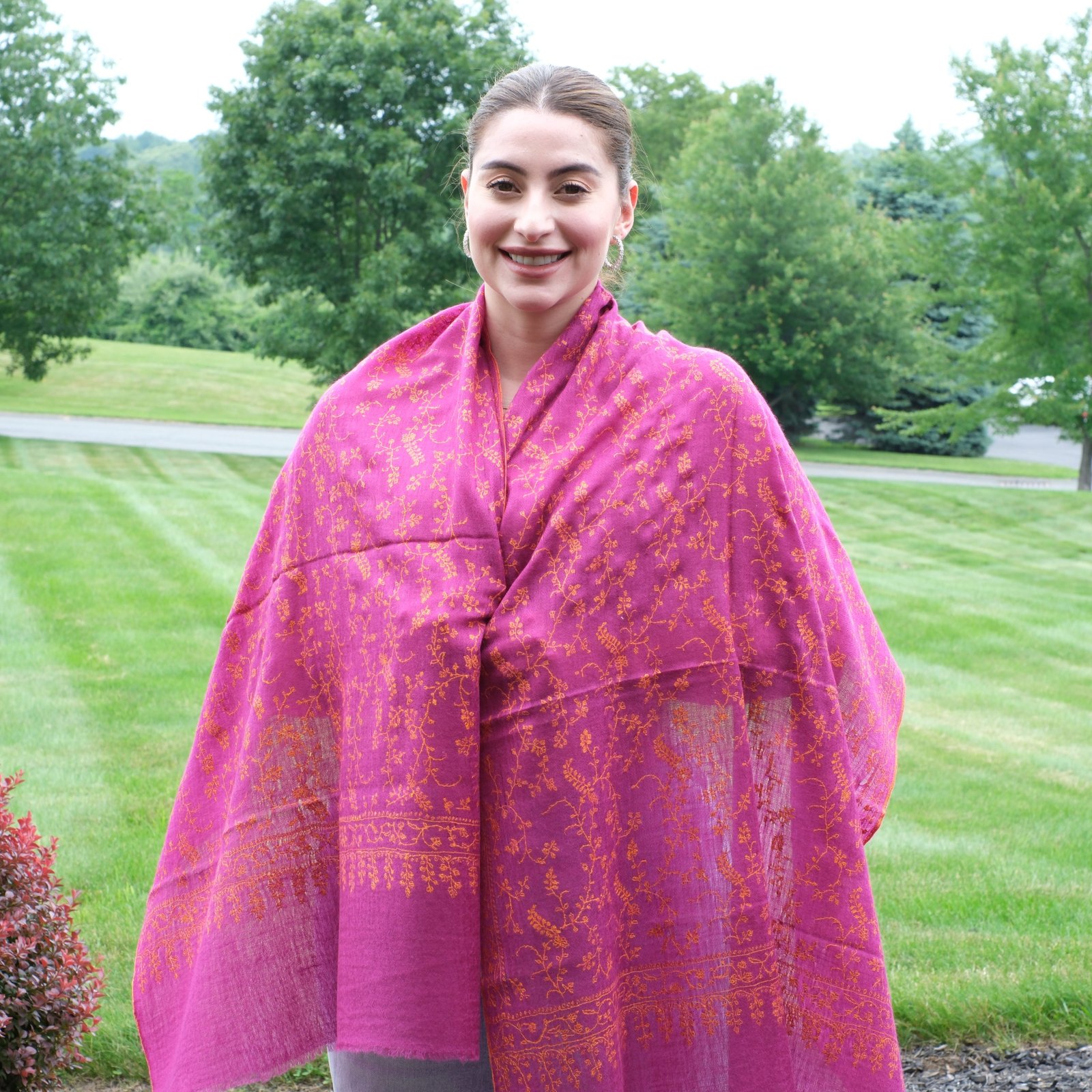 The Fuchsia Blossom Wrap is a piece made to shine. Handwoven from pure Ladakhi pashmina and finished with months of detailed sozni embroidery, it brings together heritage craft and vibrant modern style. The bold fuchsia-pink base is full of life and confidence, while golden and orange threads bloom across it in fine jaal work, adding depth and glow.