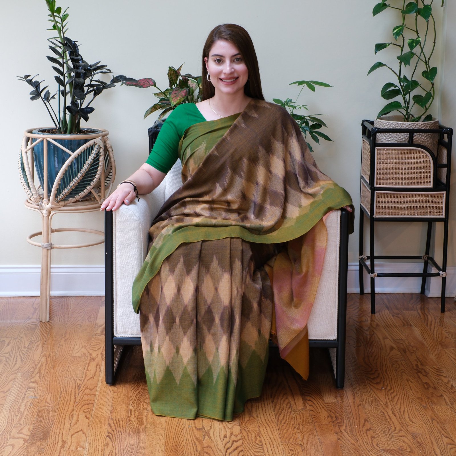 The saree carries earthy tones of brown, gold, and green, flowing together like shifting horizons at sunset. The pallu, with its bold checks, adds balance and structure, making it both traditional and contemporary at once. Draped, it feels weightless yet warm, soft against the skin, and full of character. The Horizon Whispers is for someone who appreciates craft not just as clothing, but as living art, a saree that holds both heritage and a sense of movement within it. Also its length include the Blouse piece.
