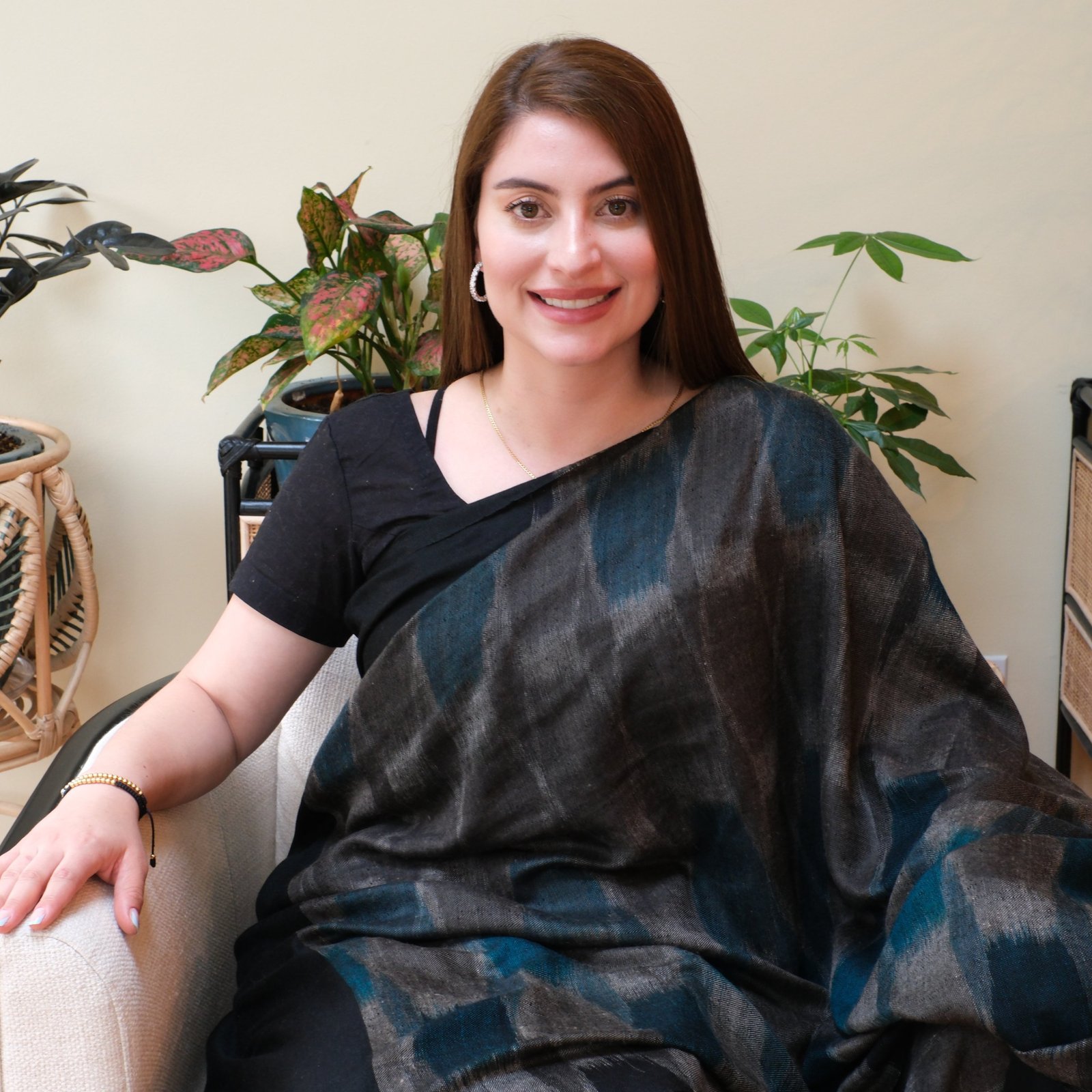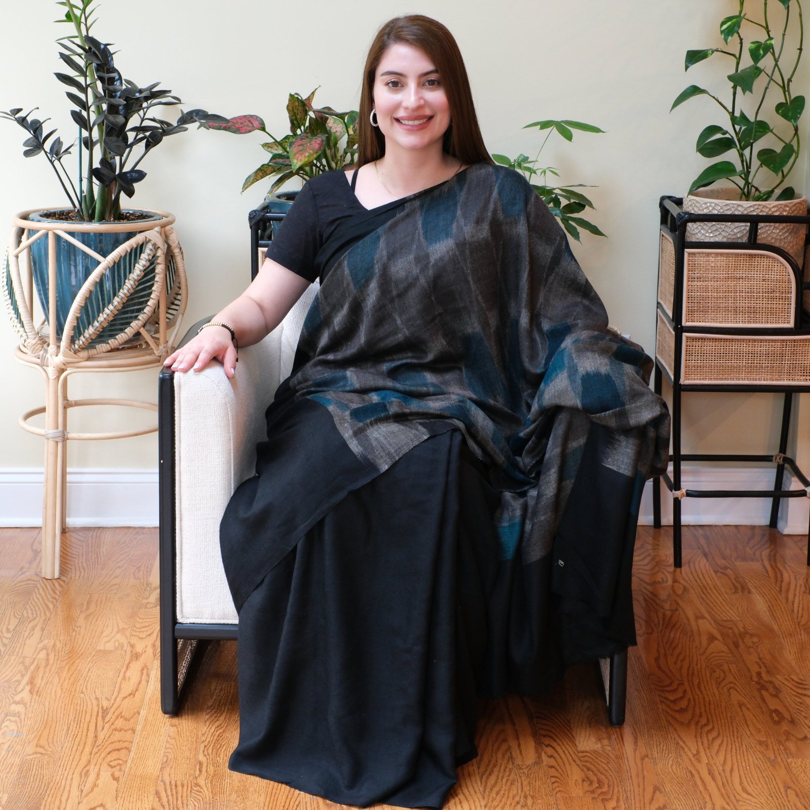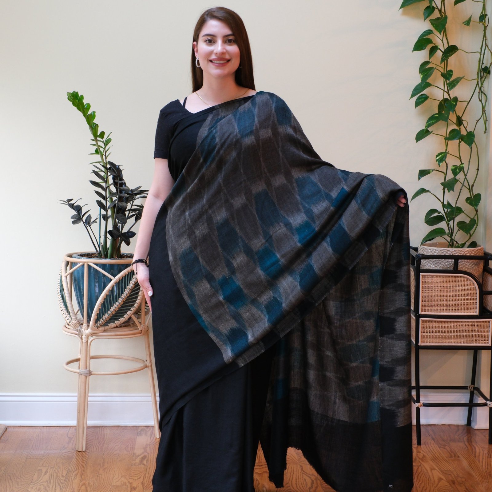 Draped in deep black and cool teal, The Midnight Whispers carries the quiet allure of the night sky. This saree is handwoven using the intricate ikat technique, where each thread is dyed with care before it meets the loom. The result is a play of shifting patterns, blurred yet deliberate, that feels alive, almost like shadows and moonlight in motion.
