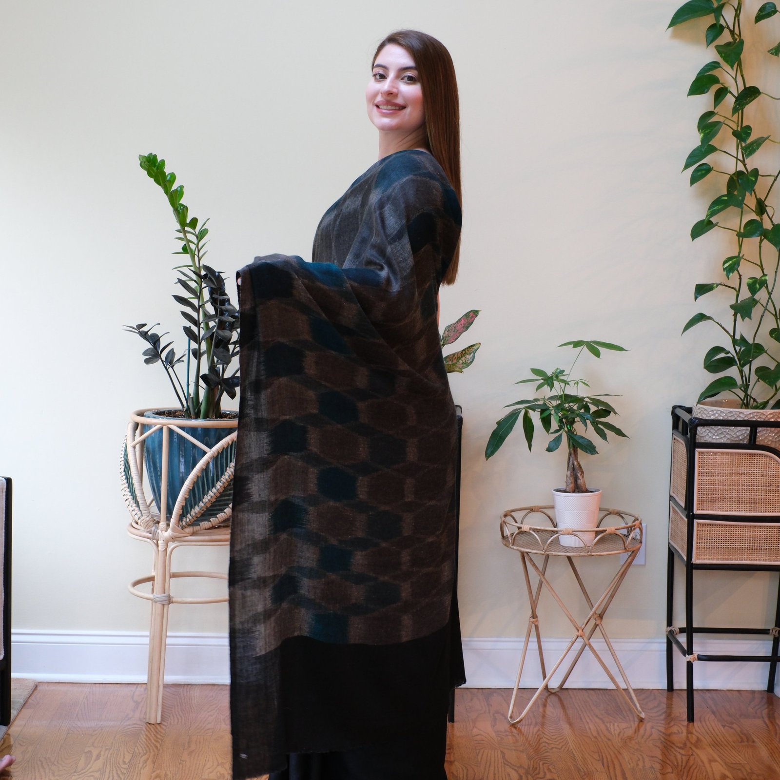 The bold black base sets the stage for geometric motifs in teal, grey, and midnight blue, giving the saree a refined, contemporary edge. Despite its striking look, it remains soft, light, and effortless to drape, thanks to the use of pure Ladakhi pashmina. Woven over months of patient craftsmanship, it’s more than fabric, it’s a story of heritage reimagined for the modern world. The Midnight Whispers is perfect for evenings when you want to stand out quietly, with grace and strength woven into every thread. Also its length include the Blouse piece.