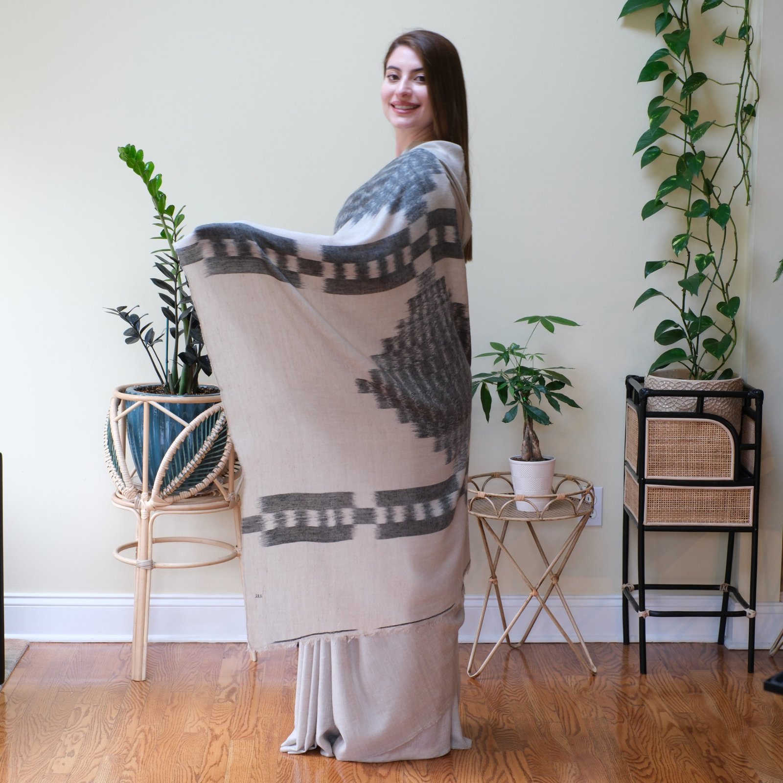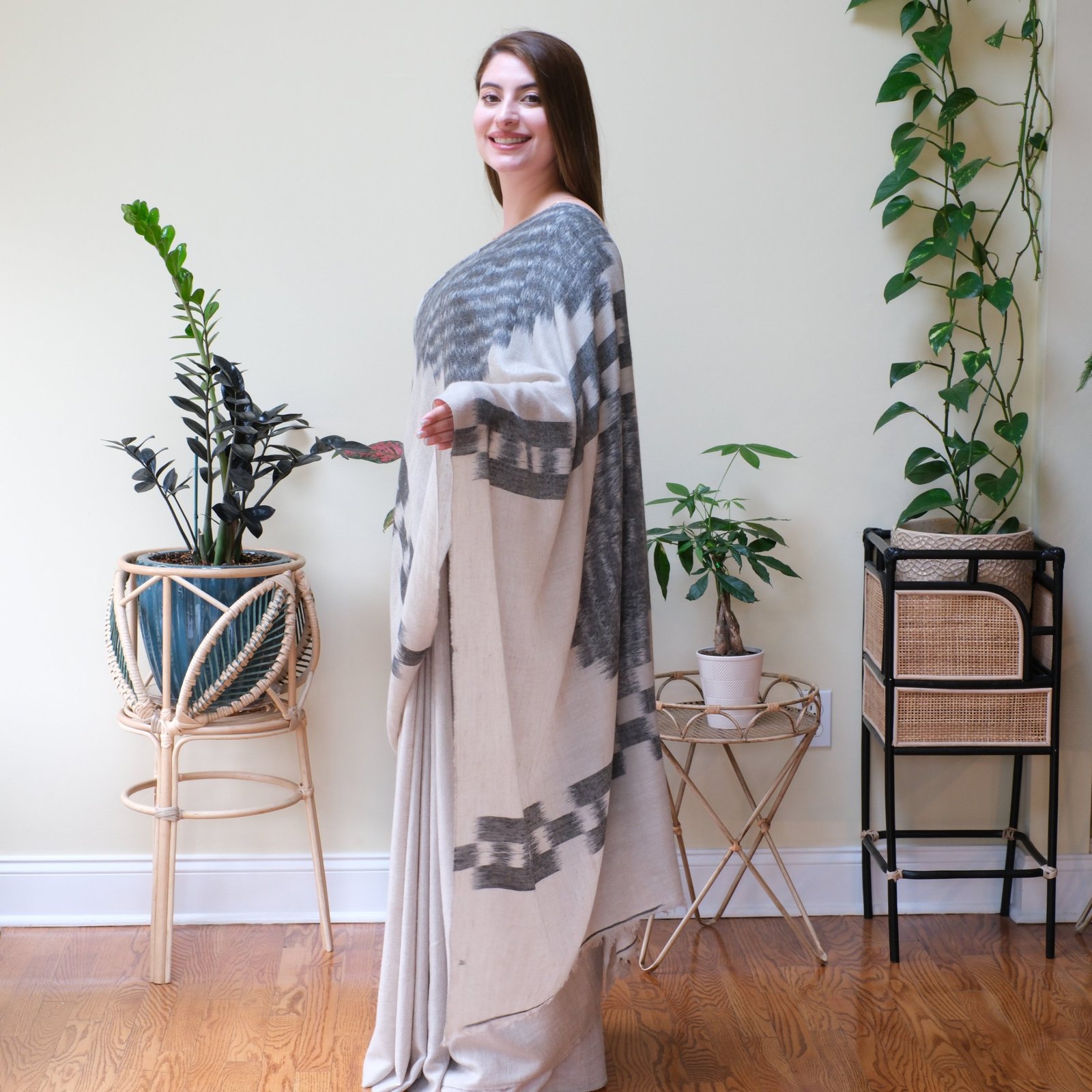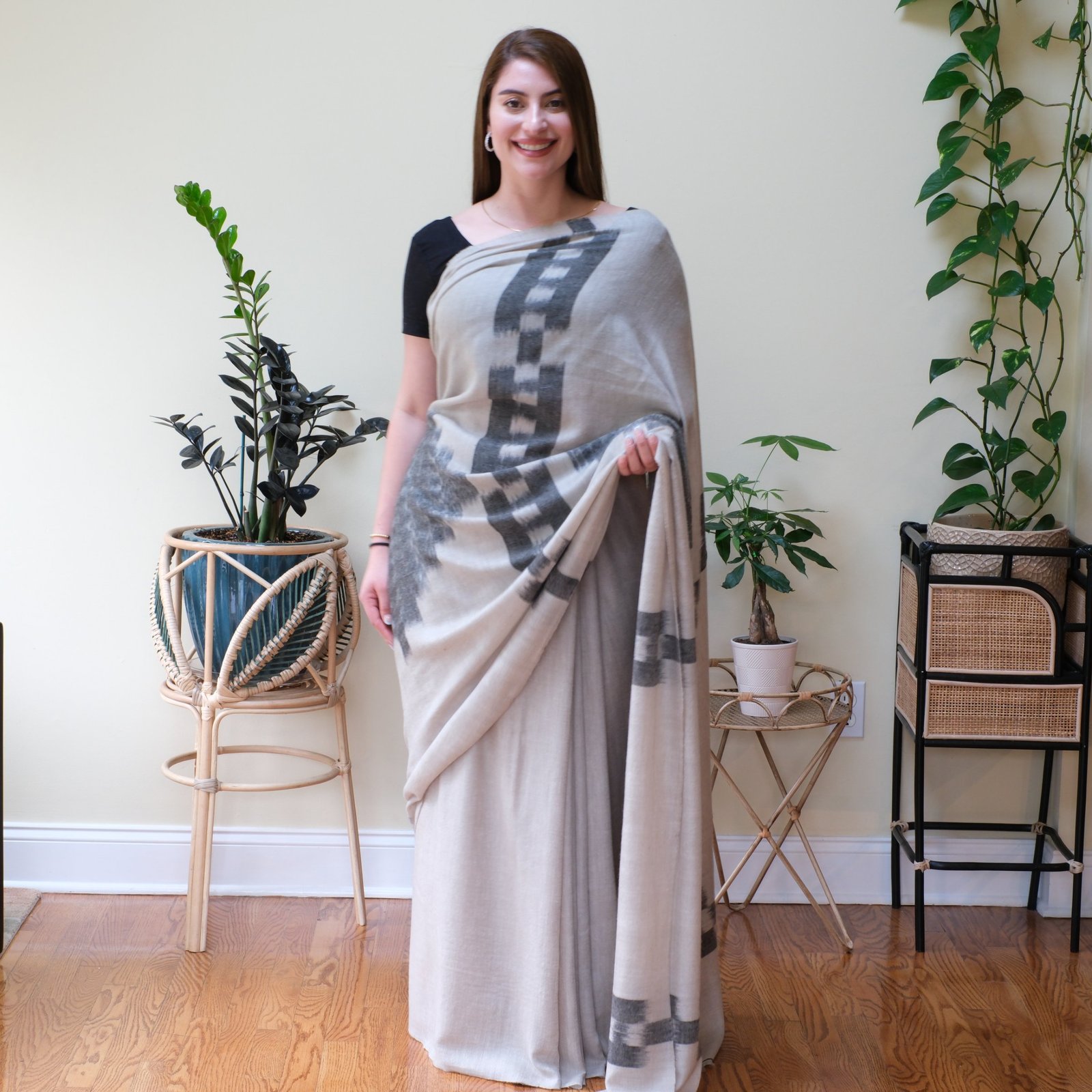 There’s a quiet power in simplicity, and The Monochrome Whispers embodies exactly that. Handwoven over 2 months in Ladakh, this pashmina saree brings together the softness of tradition with the sharpness of modern design. The base is a gentle beige, calm and understated, while bold grey-black geometric patterns break through with confidence, almost like brushstrokes on a canvas.