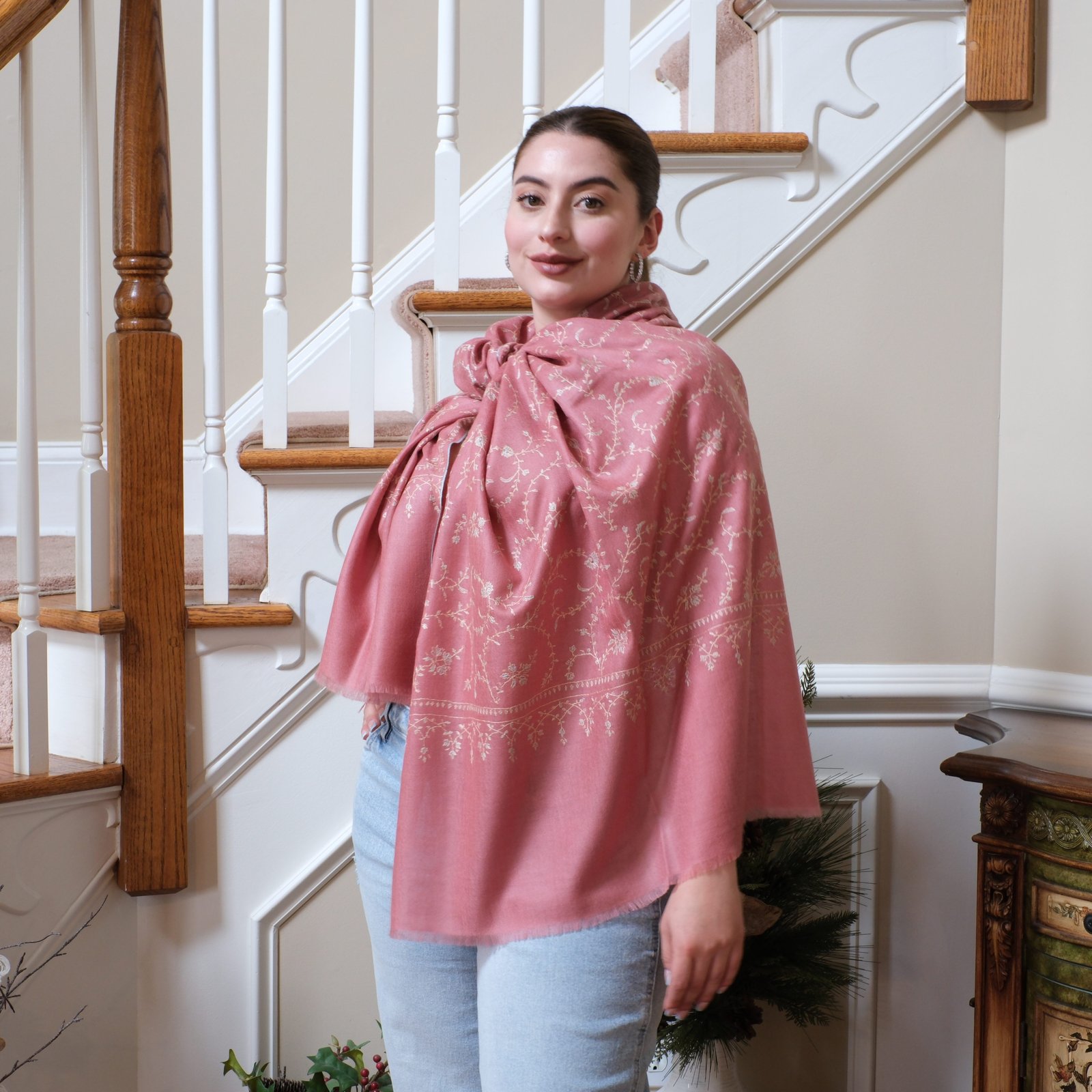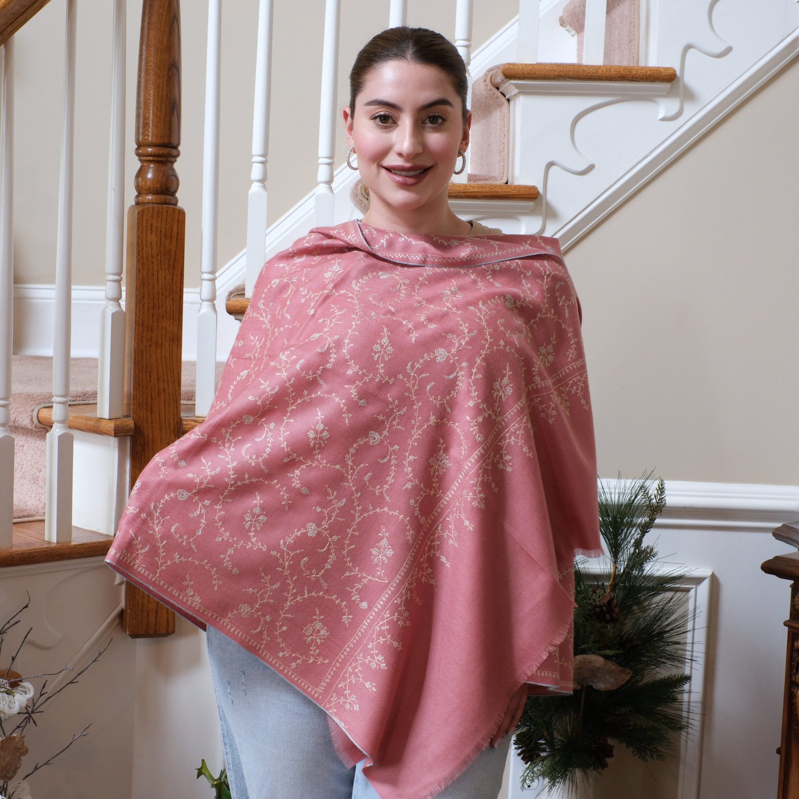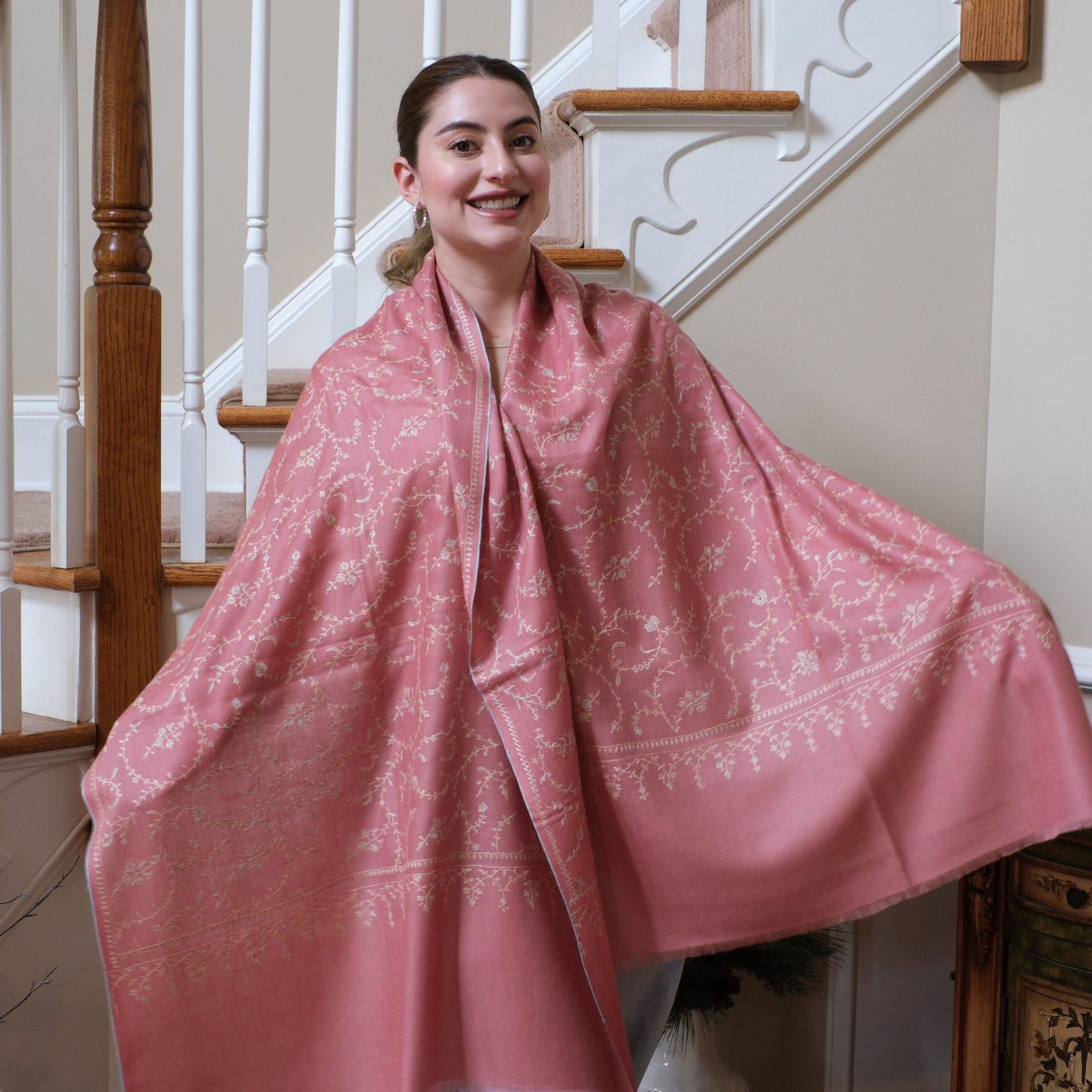 Soft, romantic, and timeless, The Rose Blossom Wrap is a celebration of gentle beauty. Handwoven from pure Ladakhi pashmina and embroidered with delicate sozni jaal, it takes months of careful stitching to complete. The rose-pink base feels warm and inviting, while the ivory embroidery adds lightness, almost like a garden of blossoms scattered across the fabric.