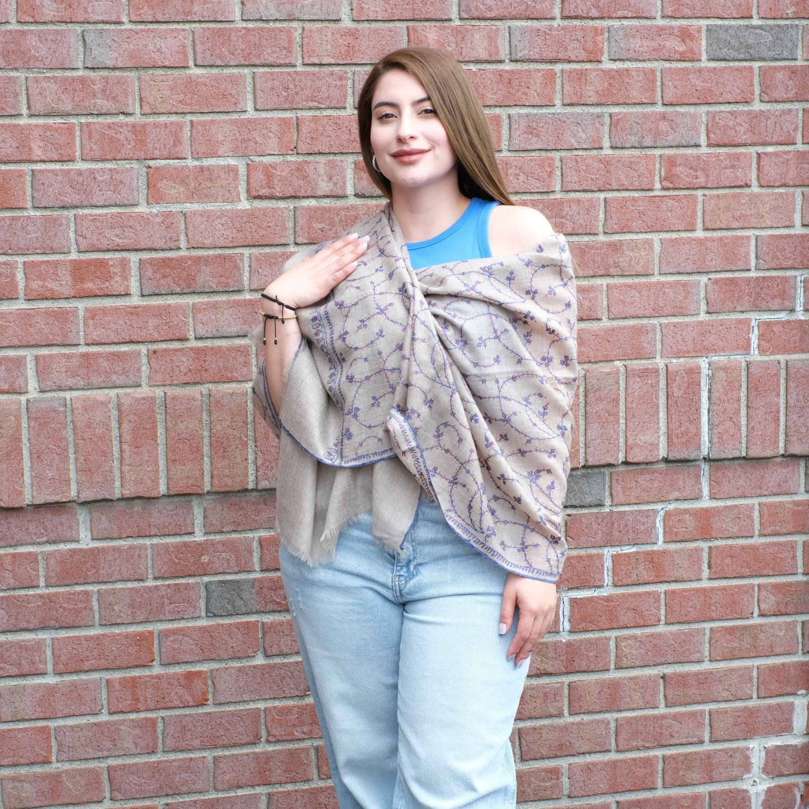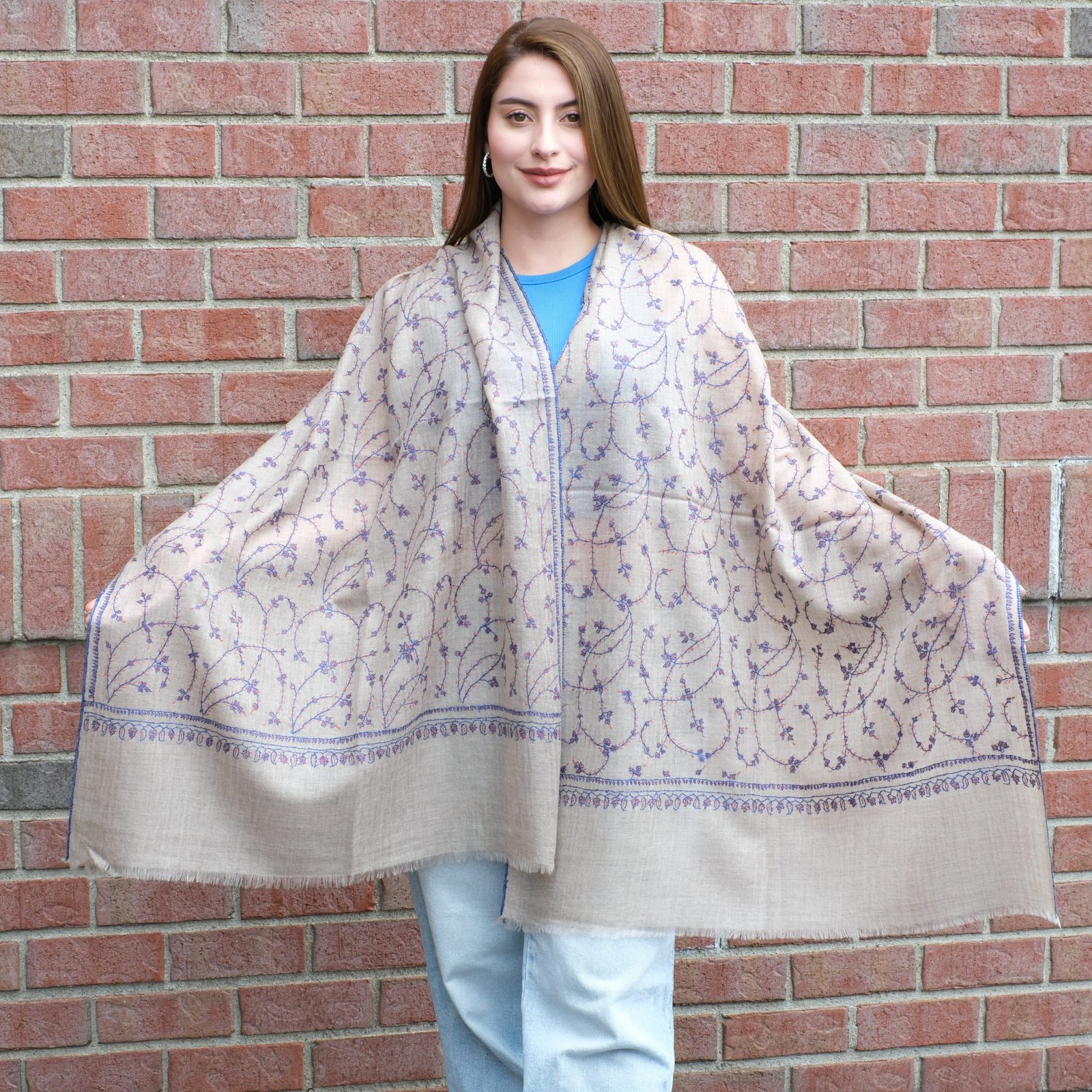 The Serenity Jaal Wrap is crafted for those who find beauty in balance. Handwoven from the finest Ladakhi pashmina and embroidered with an intricate sozni jaal, it reflects months of patient craftsmanship. The warm beige base feels grounded and versatile, while the soft blue embroidery brings a calm, soothing elegance, like the quiet of early morning skies.