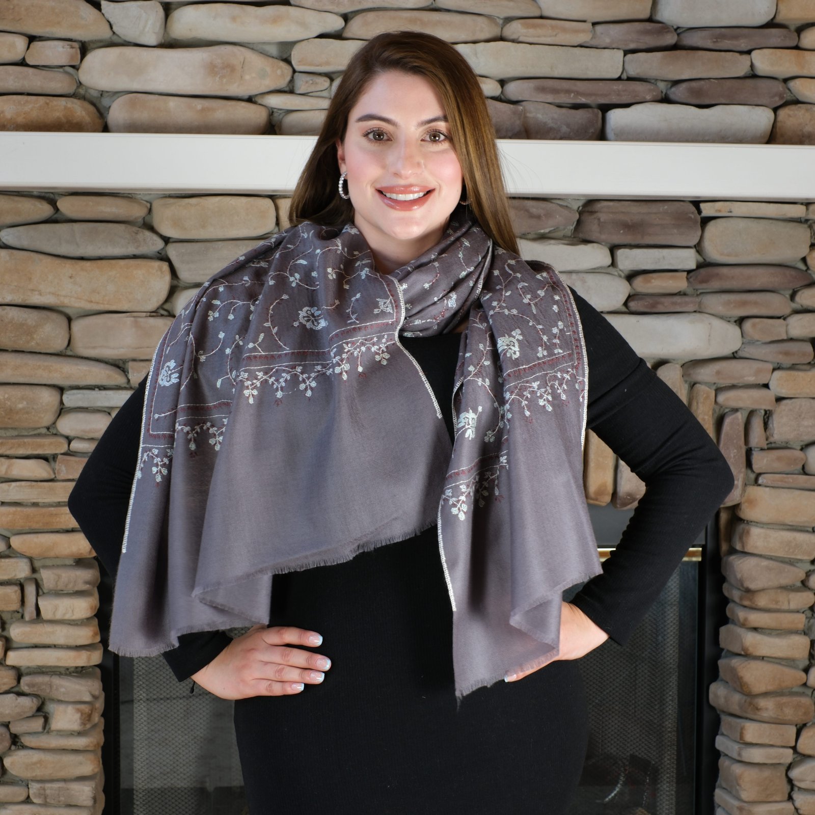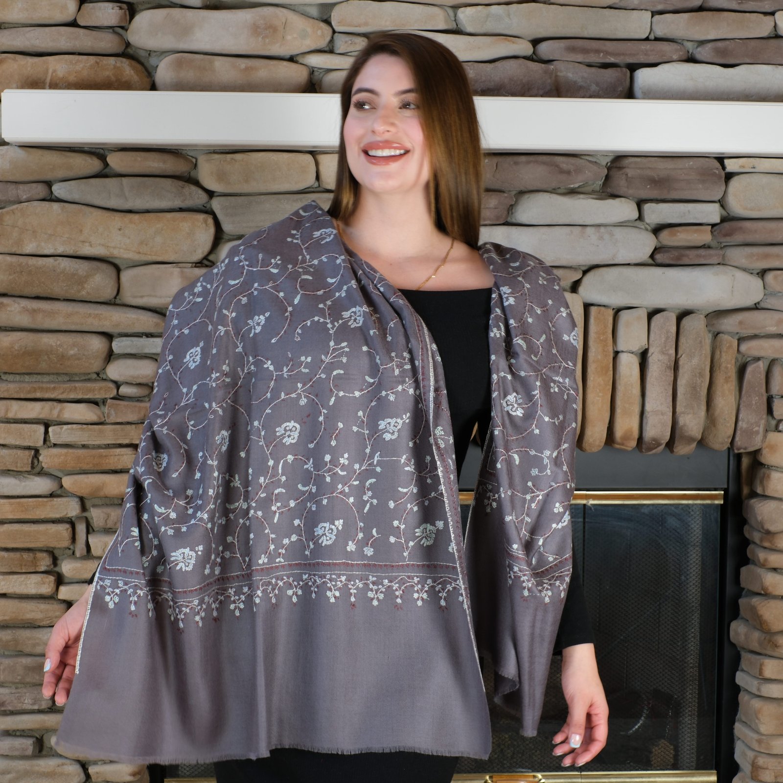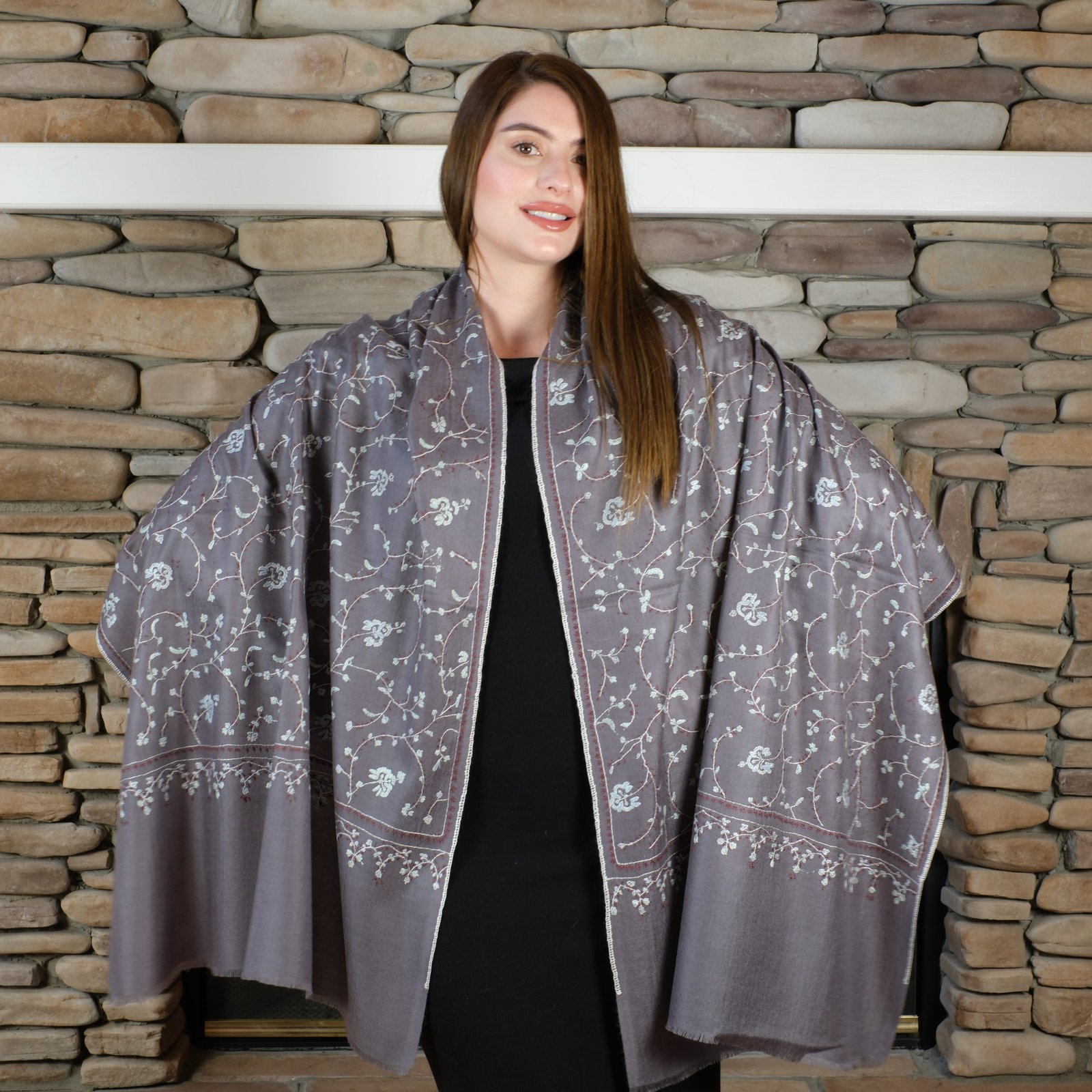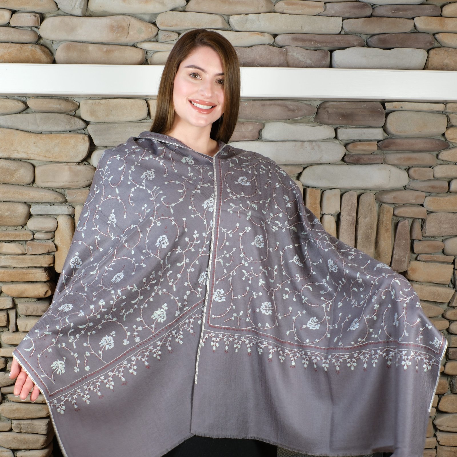 The Skyline Shadow Wrap brings quiet strength and grace to the Skyline Series. Handwoven from pure Ladakhi pashmina and covered in intricate sozni jaal embroidery, it represents months of artistry and devotion. The slate-grey base has a contemporary, city-inspired edge, while the pastel tones of the embroidery, soft blue, pink, and white, lighten it with subtle elegance.