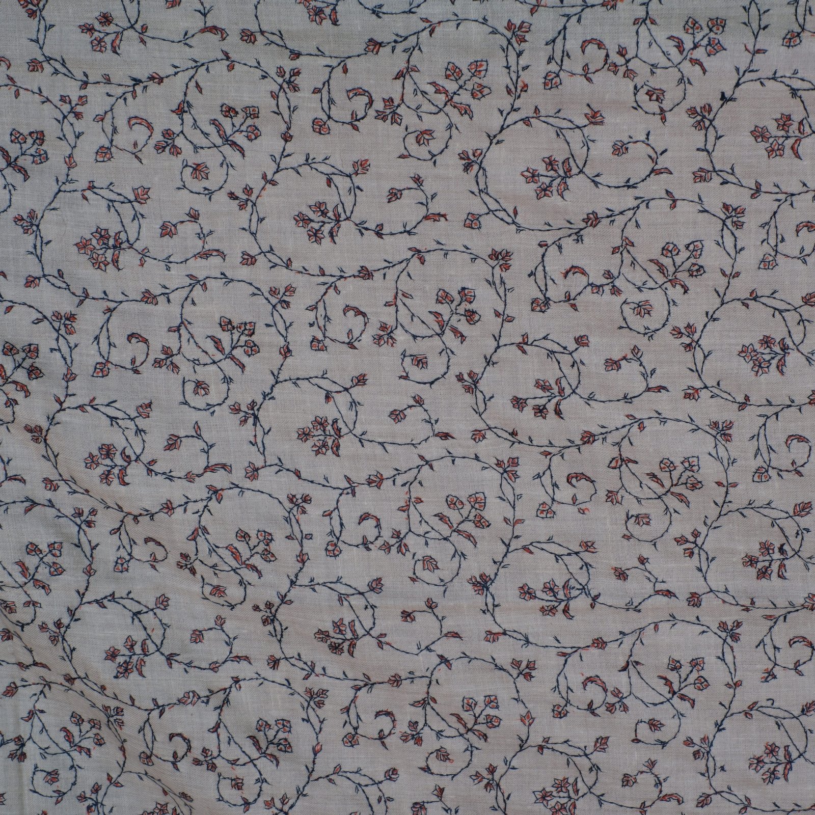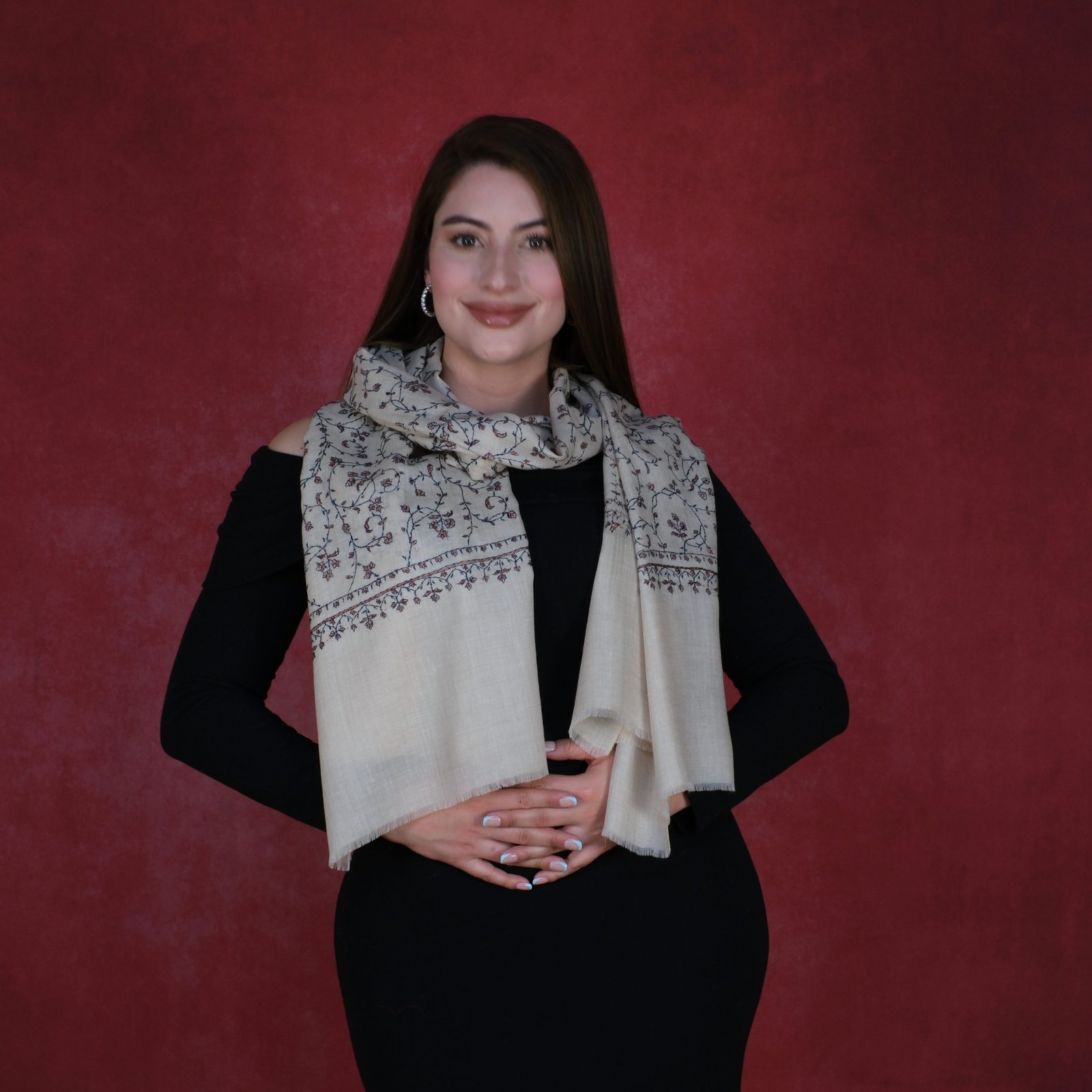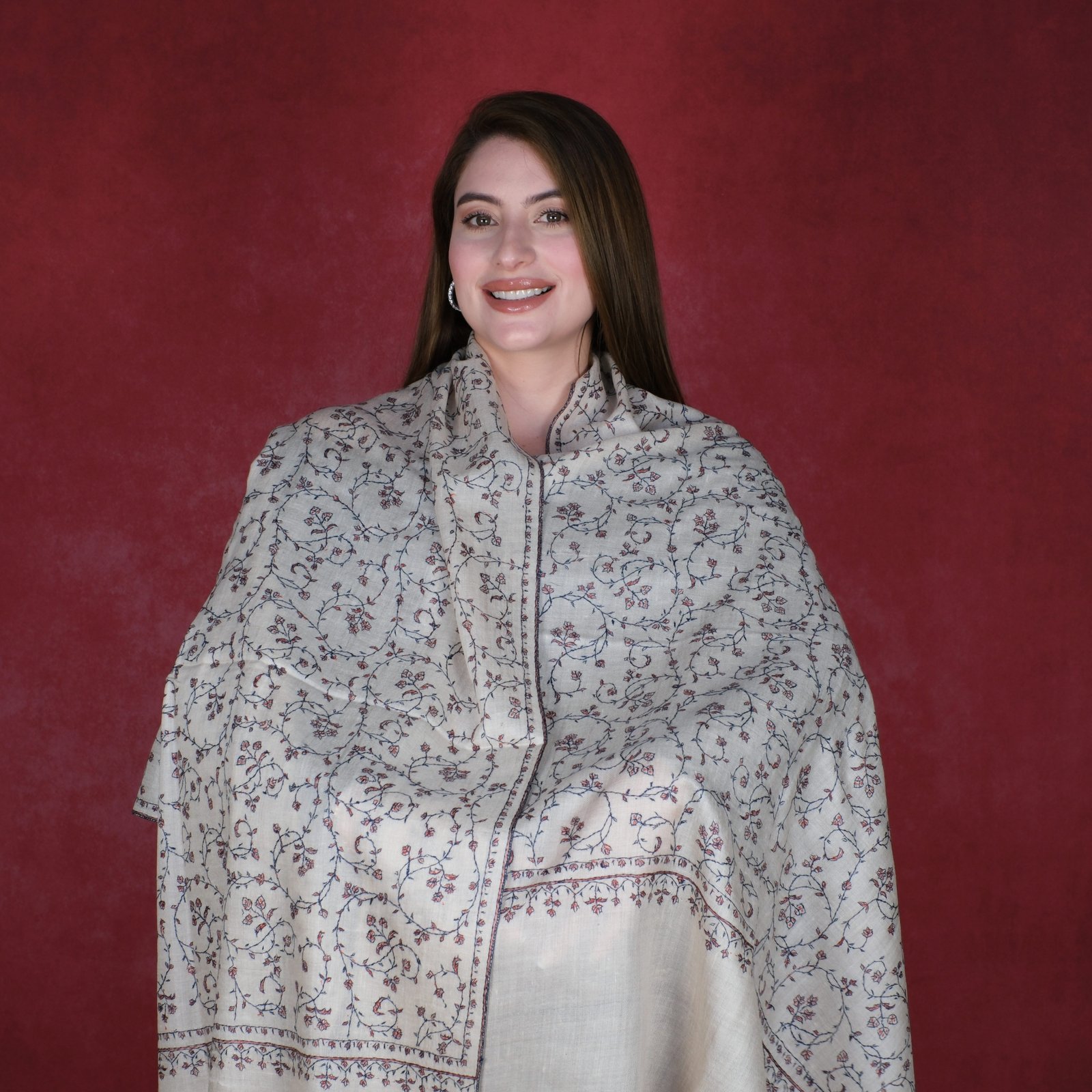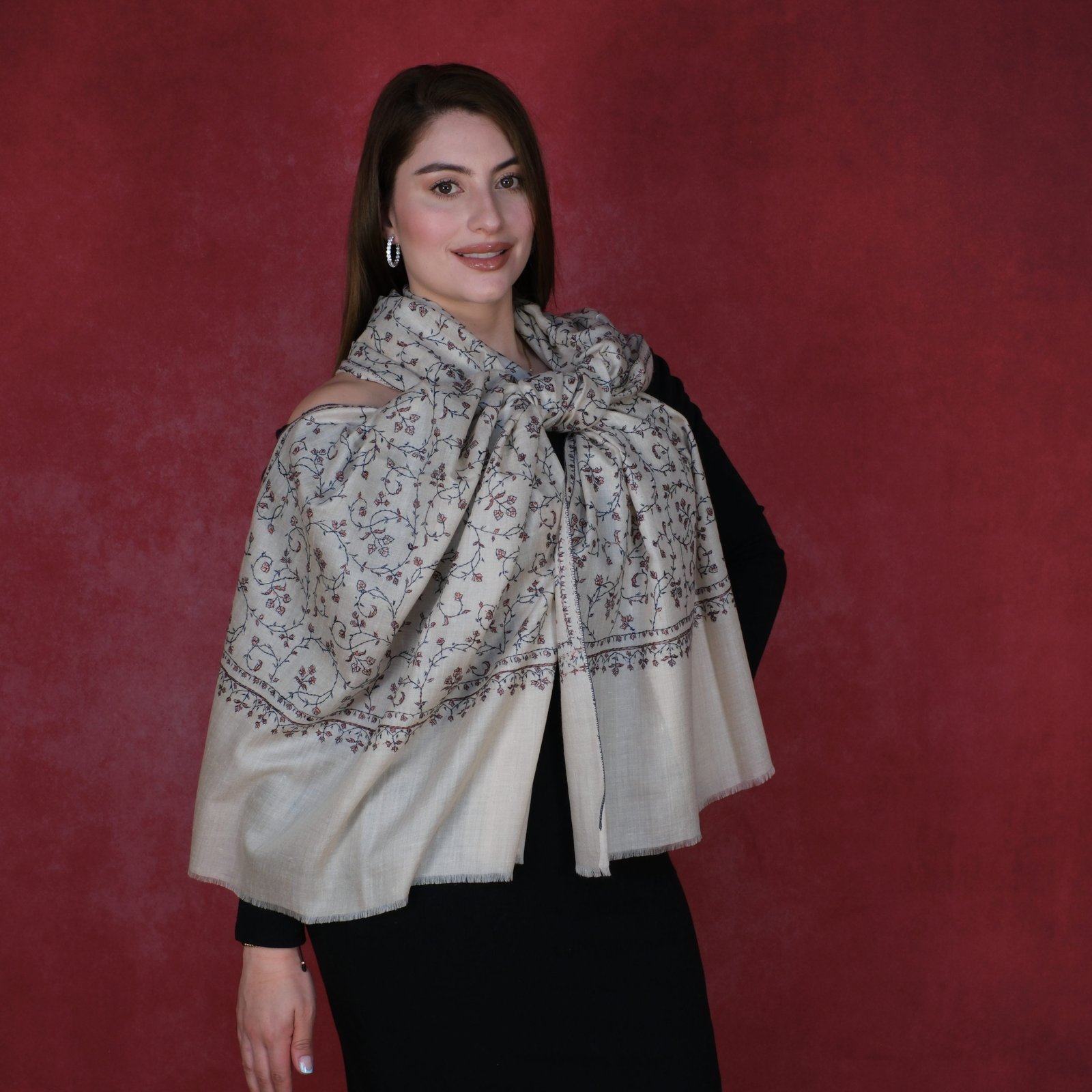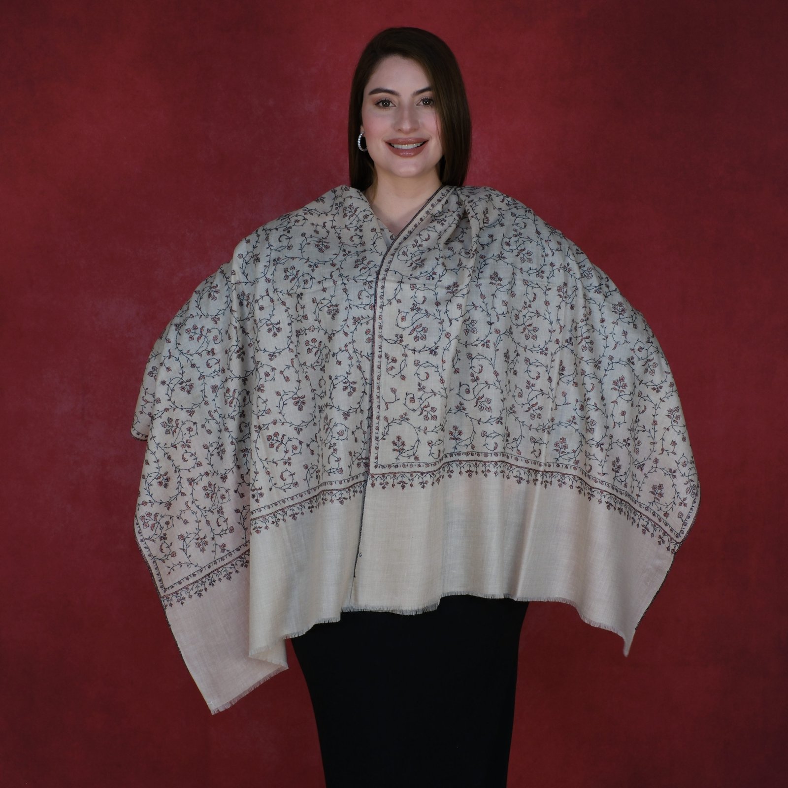 The Skyline Vine Wrap is a piece that feels alive in its detail. Woven from pure Ladakhi pashmina and hand-embroidered with a full sozni jaal, it carries months of slow, patient work by skilled artisans. The ivory base keeps it calm and timeless, while the flowing vines and delicate florals stitched in shades of red, green, and soft gold bring warmth and quiet movement to the design.