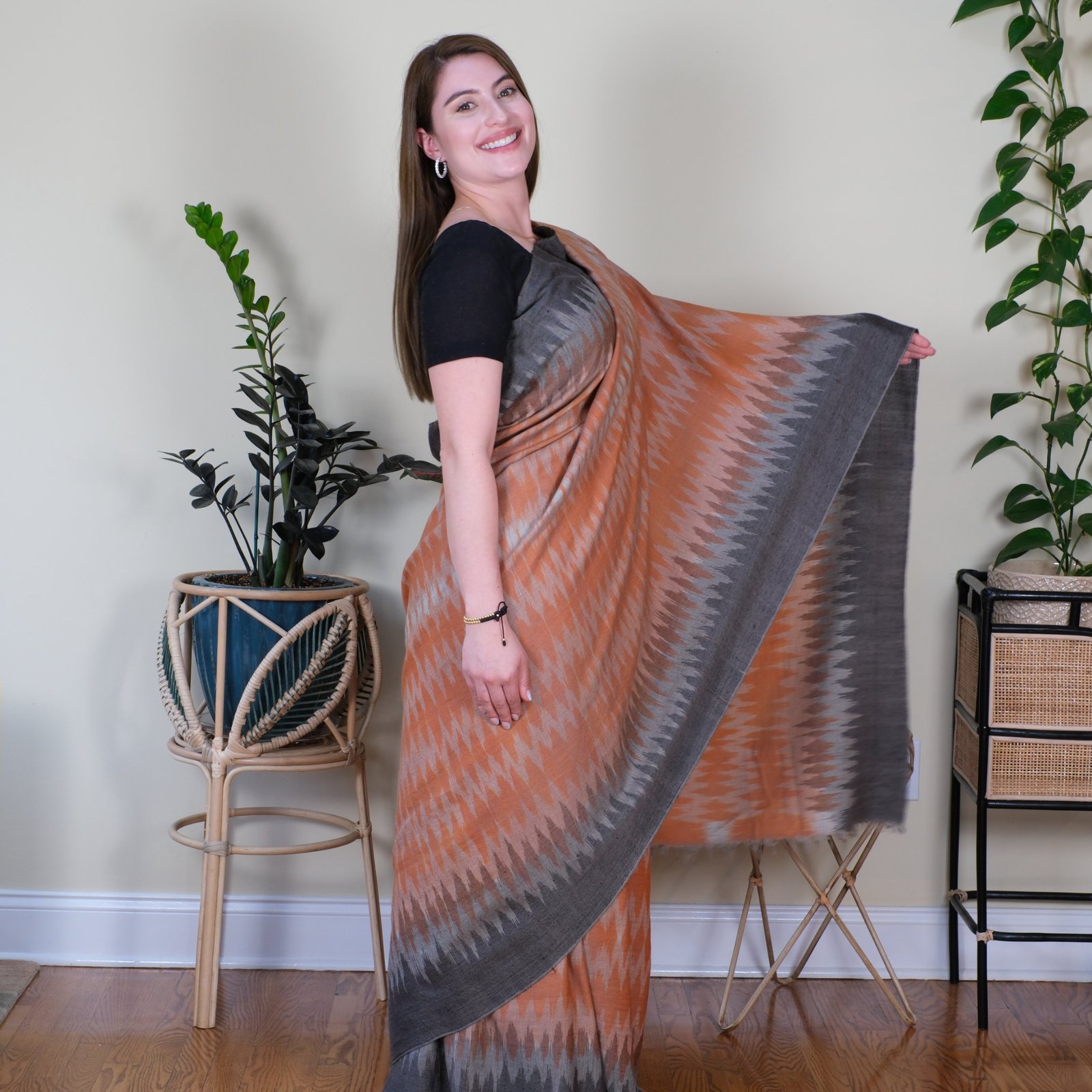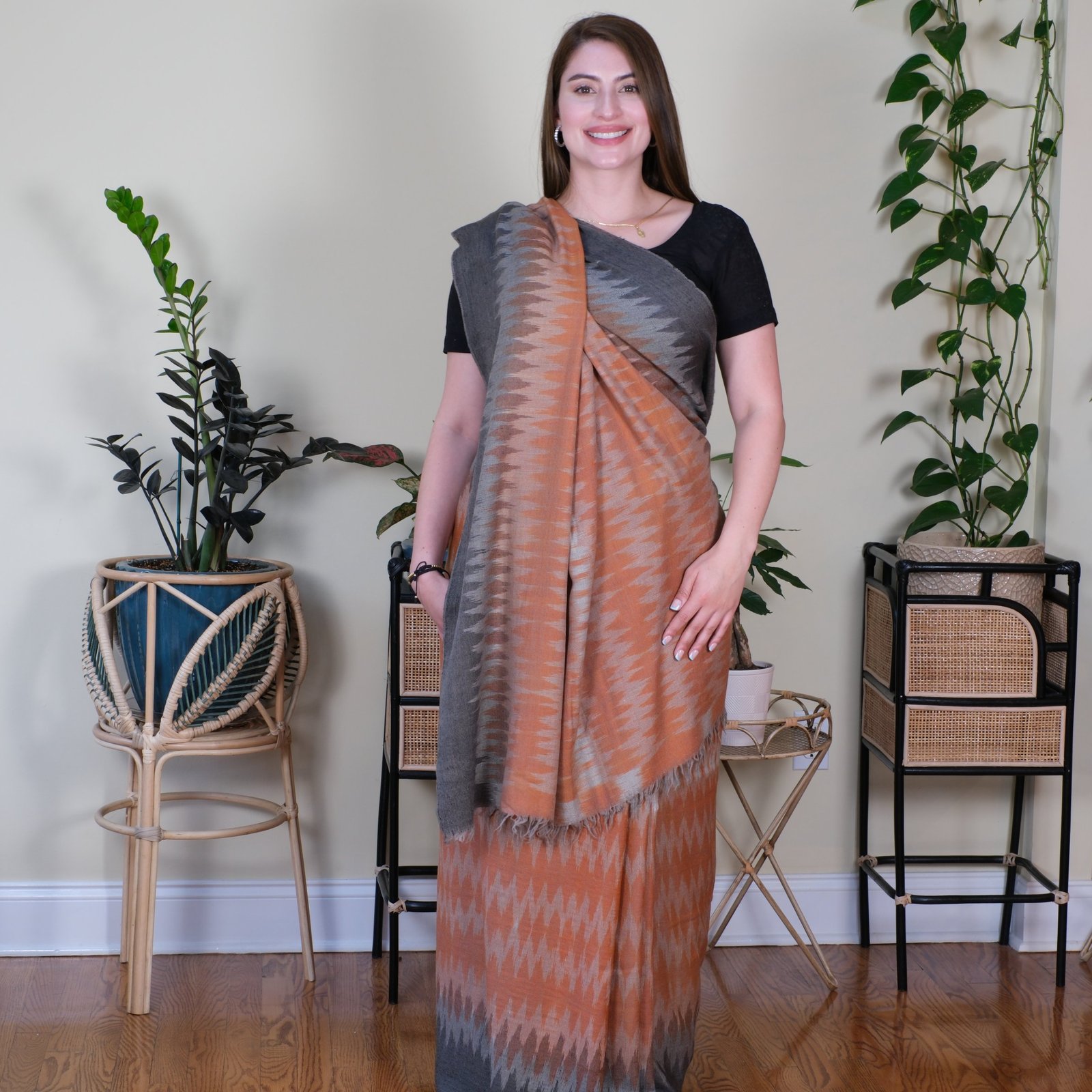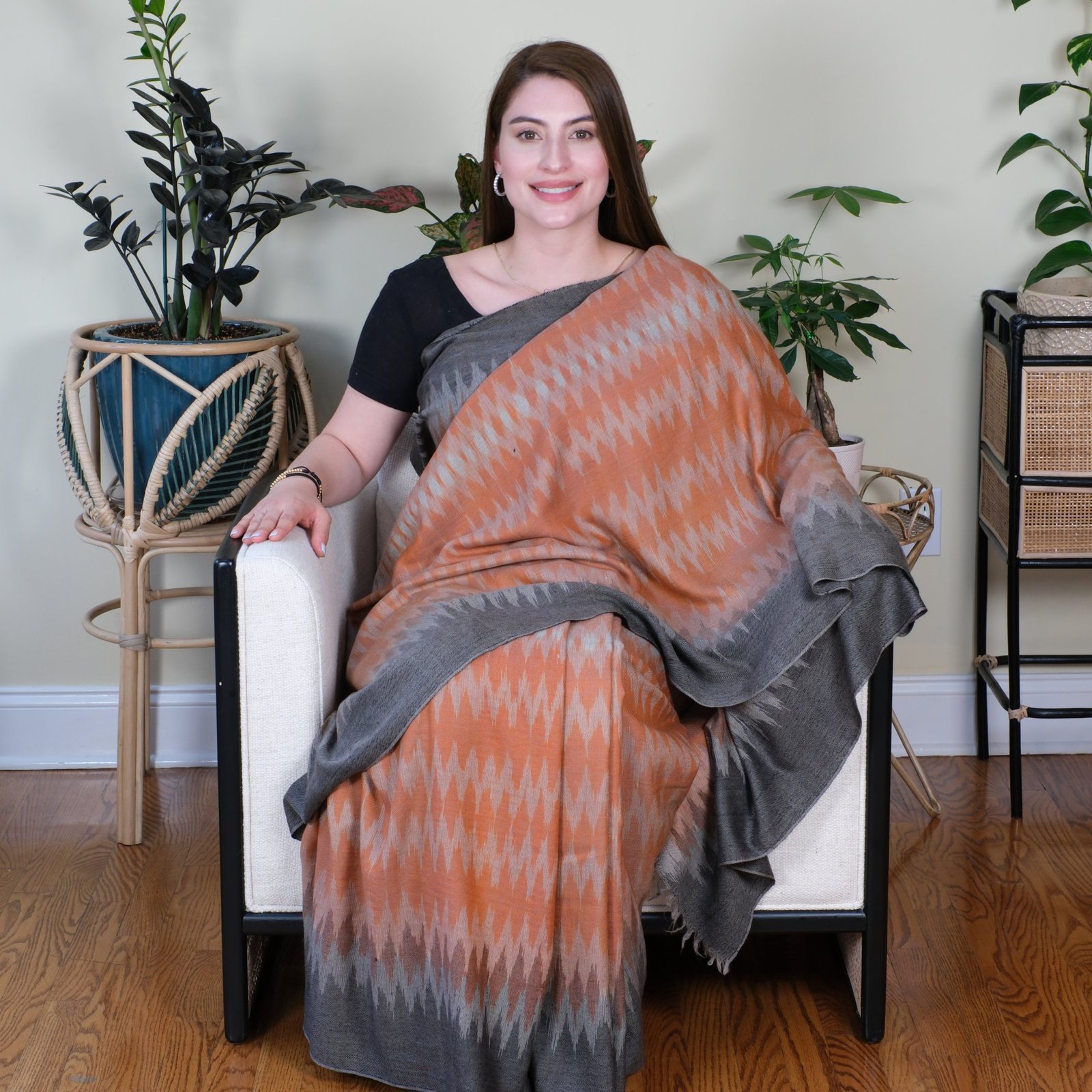 The color palette is what makes it truly unforgettable, warm terracotta-orange blending seamlessly with steel-grey and black, like embers glowing against a stormy night sky. The pure Ladakhi pashmina base keeps it feather-light and soft to the touch, offering comfort along with sophistication. Draped, it exudes strength, elegance, and modern boldness while honoring an age-old weaving tradition. The Storm Whispers is not just a saree, it is a statement, a piece of wearable art that turns every occasion into something extraordinary. Also its length include the Blouse piece.