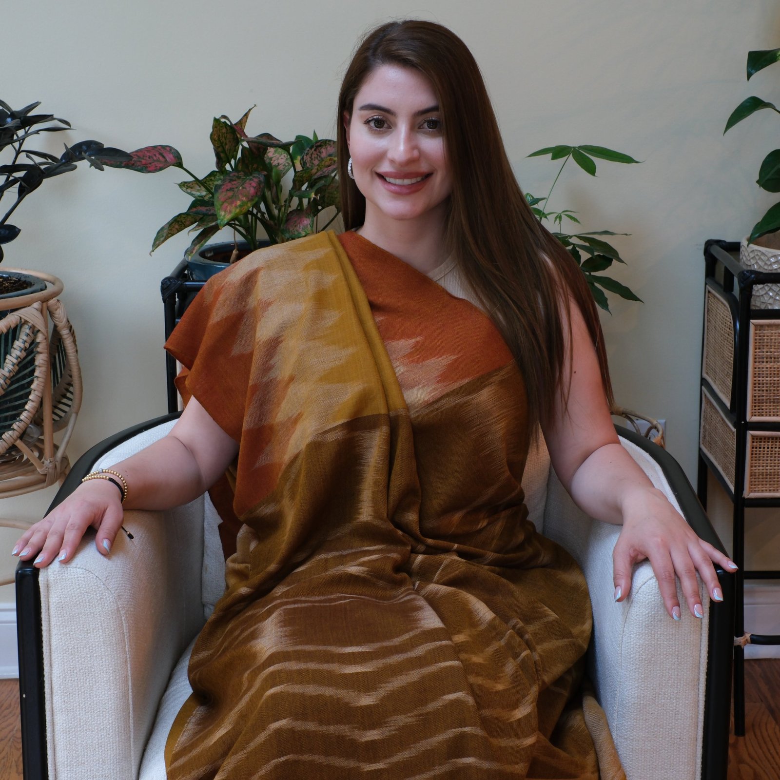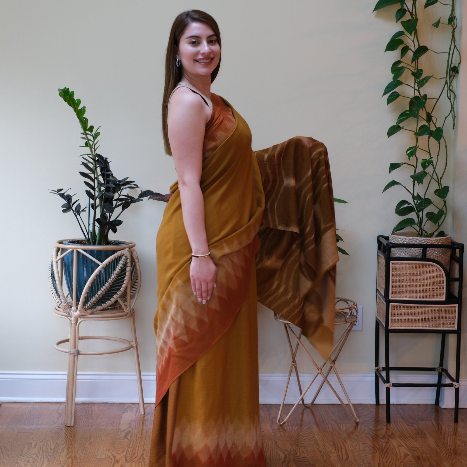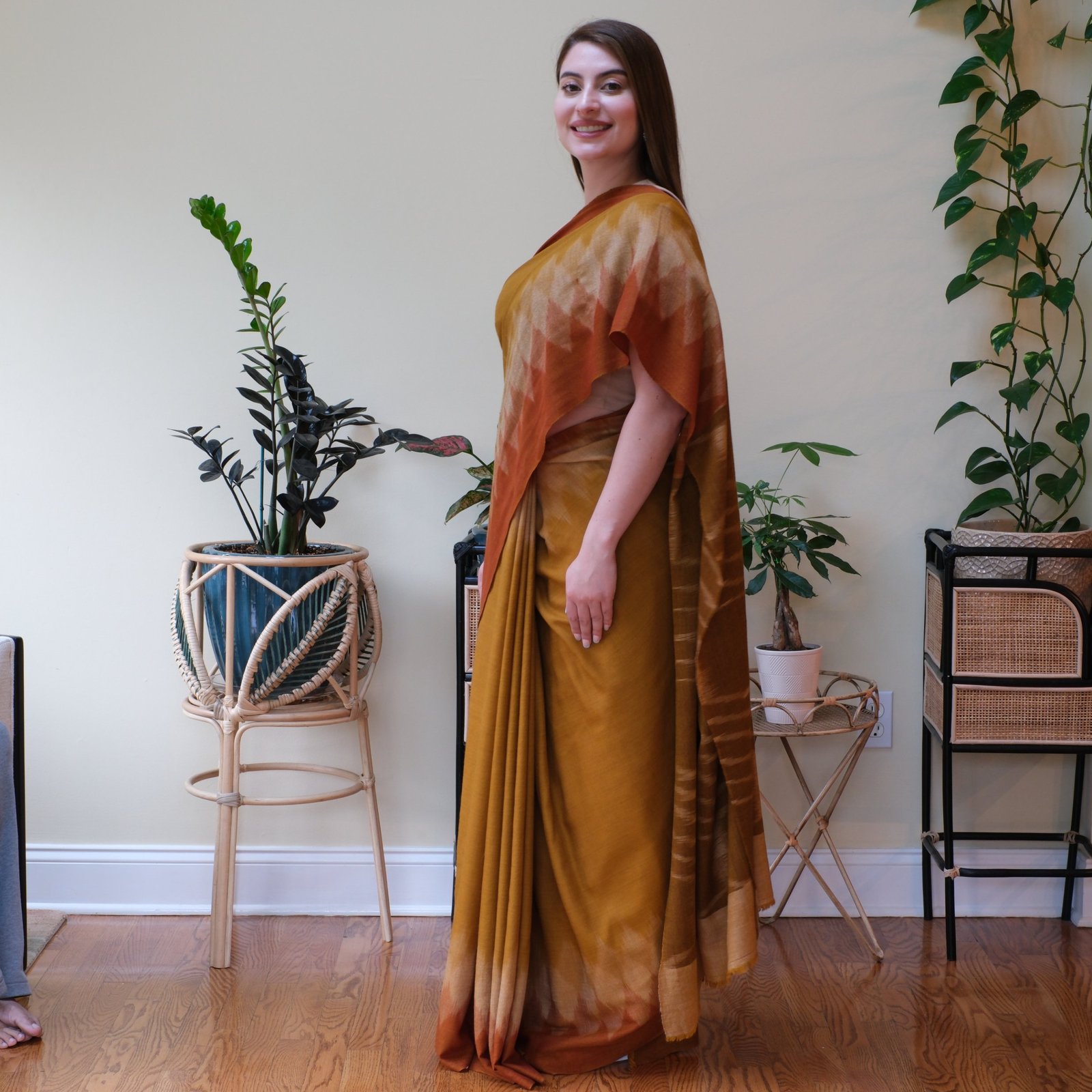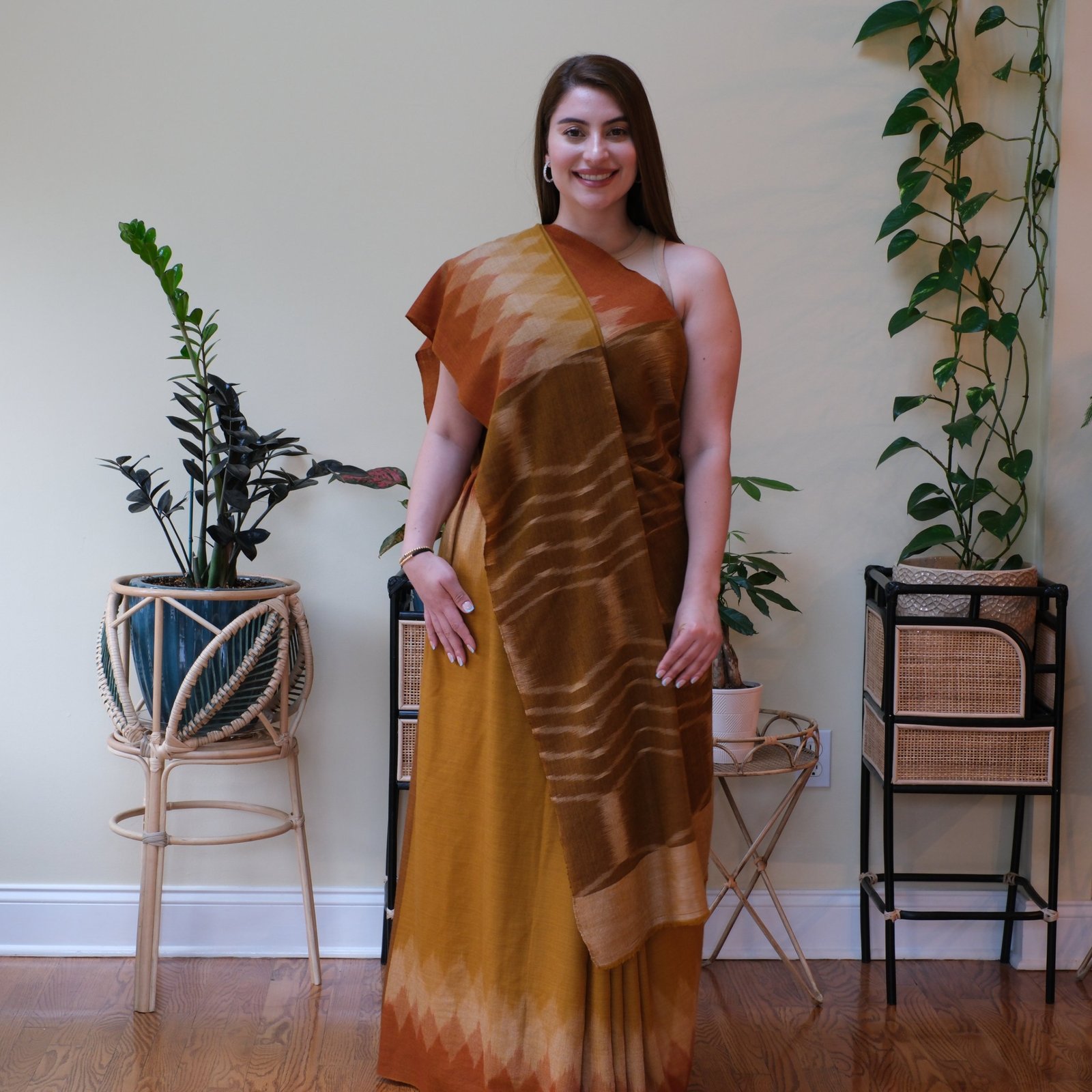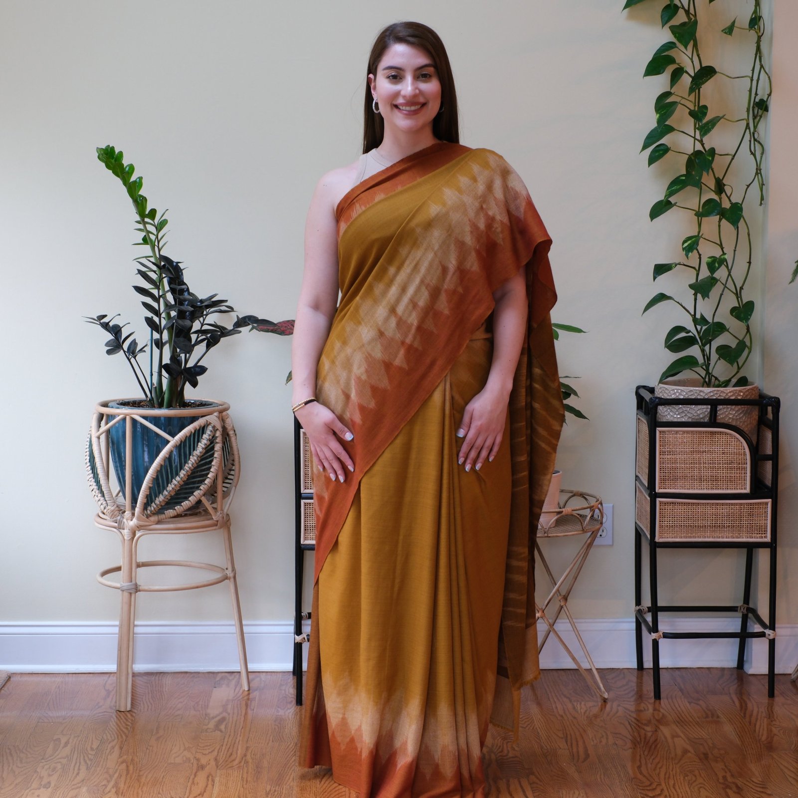 Like the evening sky melting into gold and rust, The Sunset Whispers captures the beauty of a horizon in motion. This saree is handwoven in Ladakh using the intricate ikat technique, a process where each thread is dyed before being placed on the loom. It takes months of patient work to achieve this blurred, wave-like effect, where colors flow into one another as though painted by hand.