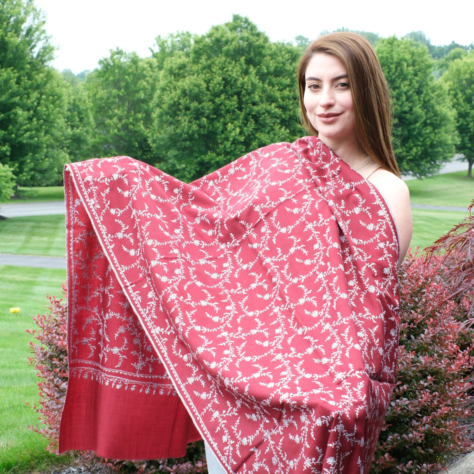 The Wine Blossom Wrap is elegance in its most natural form. Handwoven from pure Ladakhi pashmina, it is embroidered with an intricate sozni jaal, the kind of needlework that takes months of steady, patient artistry. The rich wine-red base carries depth and warmth, while the ivory embroidery softens it with grace, creating a piece that feels timeless and versatile.